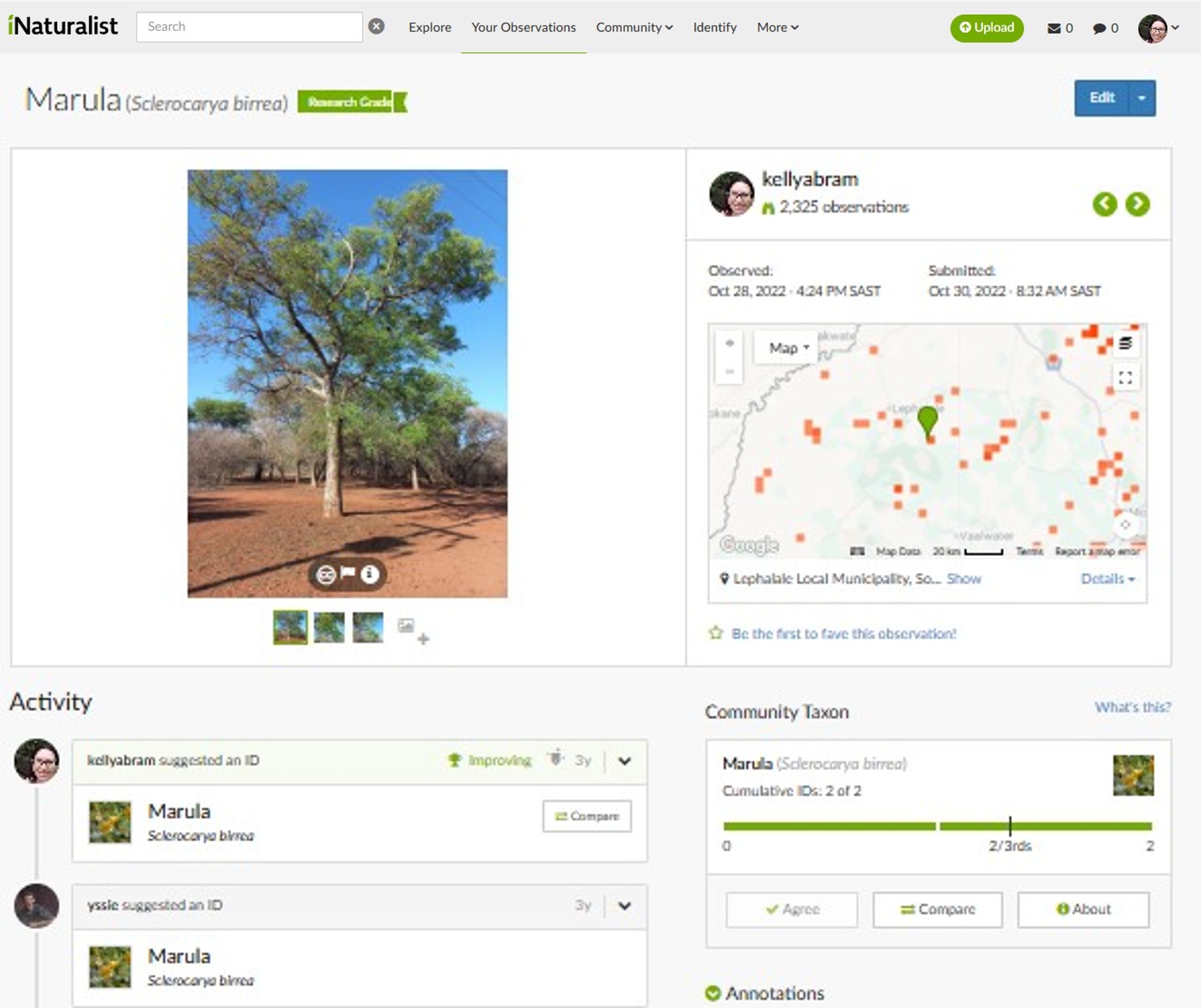 The uploaded observation is visible to the iNaturalist community, who can confirm and correct identifications. (Observations with consensus on the ID are shared with other databases used for science and conservation.)