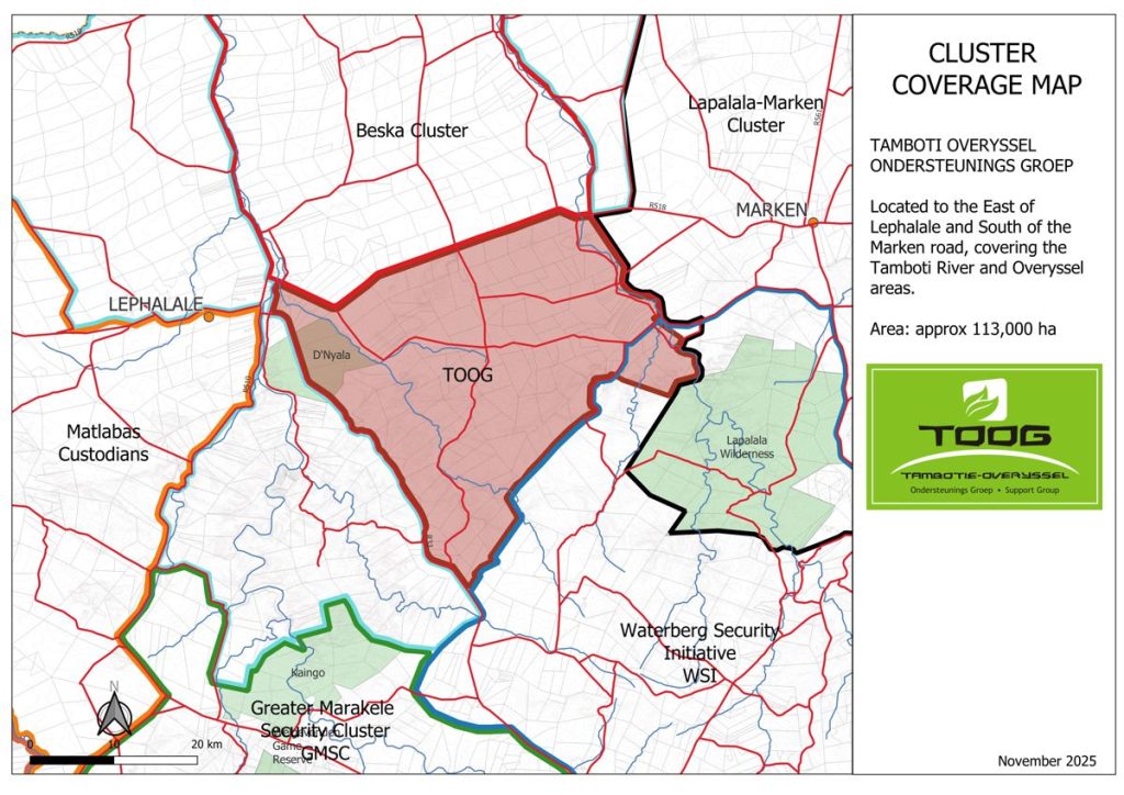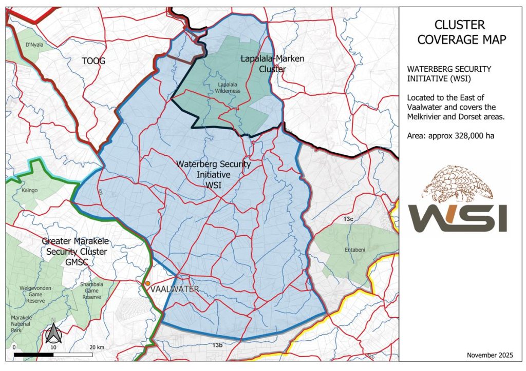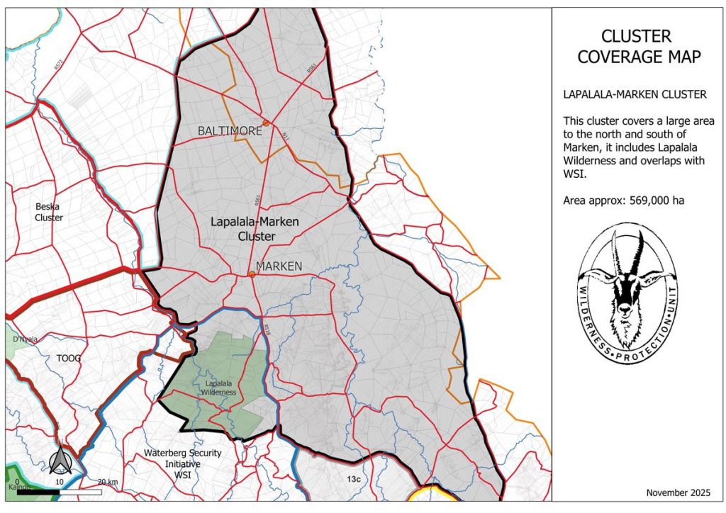The Lapalala–Marken Cluster is a collaborative security and conservation network led by JP, the Area Integrity Manager at Lapalala Wilderness. Formed under Lapalala’s Area Integrity Strategy, it focuses on rhino protection and broader crime prevention across a roughly 50 km radius around the reserve. The cluster works closely with neighbouring farmer groups, rural communities, the CPF, SAPS, and the ESU, ensuring coordinated response and trusted local contacts in each area. While not a formal membership structure, it operates on strong partnerships and community collaboration, extending support where it can make a meaningful impact. Beyond security, the cluster reflects Lapalala’s commitment to local development through education, water access, and community upliftment initiatives.