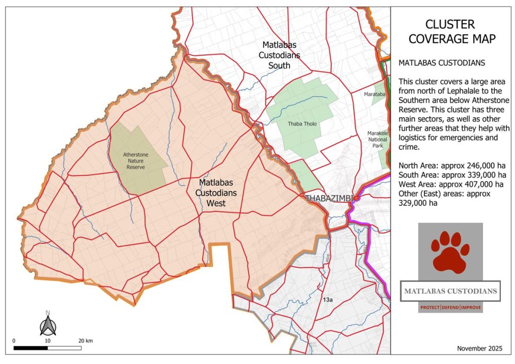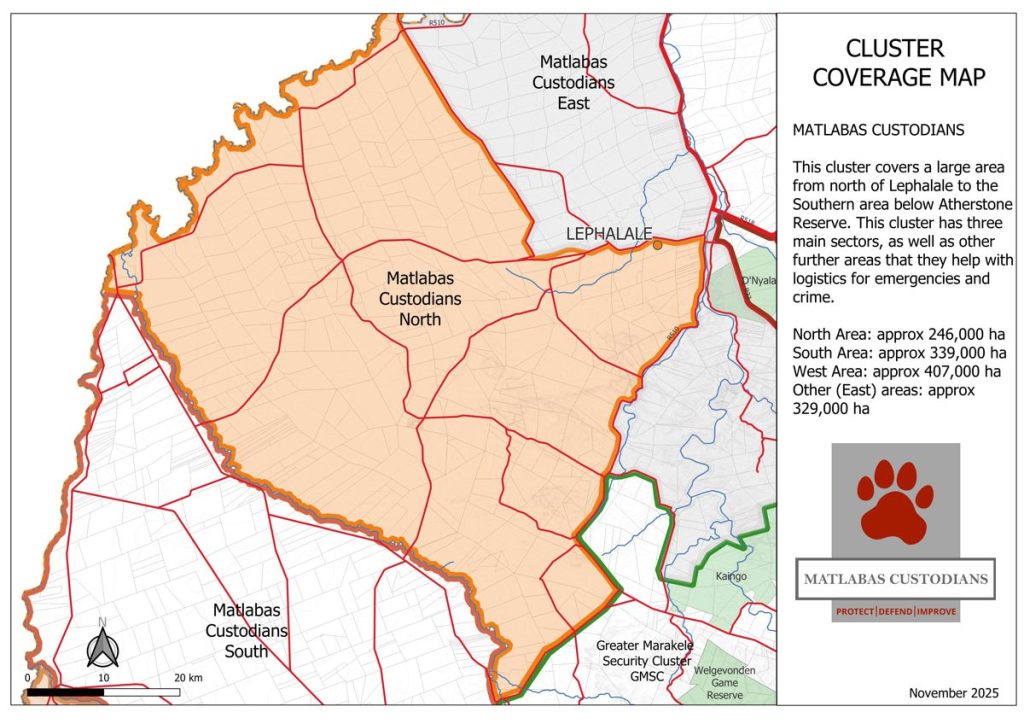 The Matlabas Custodians are a non-profit company rooted in the Western Waterberg, dedicated to protecting its wildlife, landscapes, and communities. More than conservationists, they see themselves as stewards of a legacy—guardians of the land where rhinos roam and communities thrive. Their work is driven by connection, collaboration, and sustainability, uniting landowners, residents, and partners to create a safer, more resilient region. Together, these efforts ensure that both people and nature can flourish in harmony across the Western Bushveld.