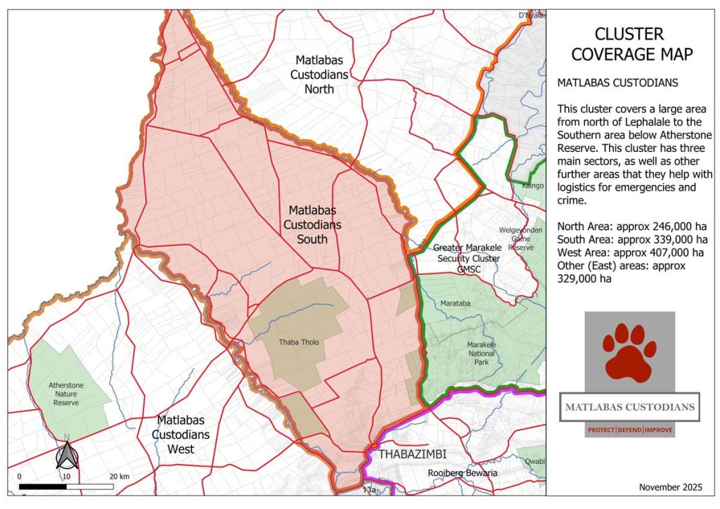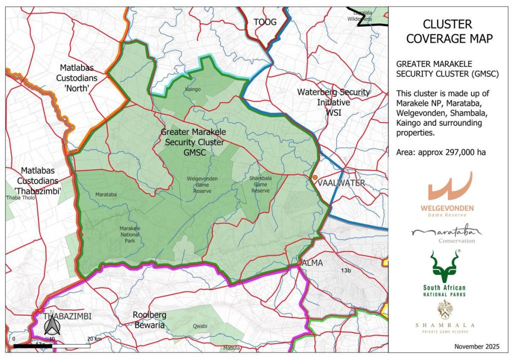 The Greater Marakele Security Cluster is a partnership focused on enhancing the protection of Marakele National Park and its surrounding areas. Comprising local law enforcement, conservation groups, and communities, it aims to combat poaching, illegal land use, and habitat destruction. By improving surveillance and fostering collaboration, the cluster ensures the long-term sustainability of the park’s ecosystems and wildlife, helping preserve the region as a key biodiversity hotspot.